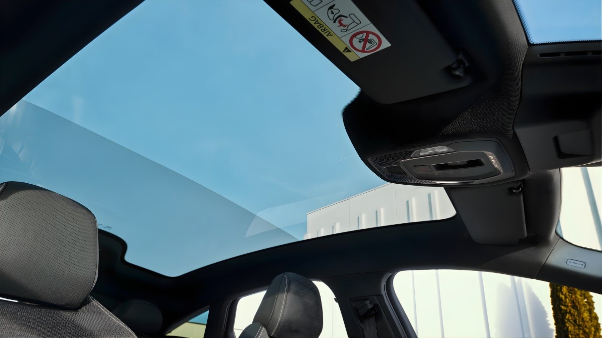 An expansive panoramic glass sunroof enhances the cabin, with individually adjustable segments to control light and shading for added comfort.